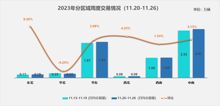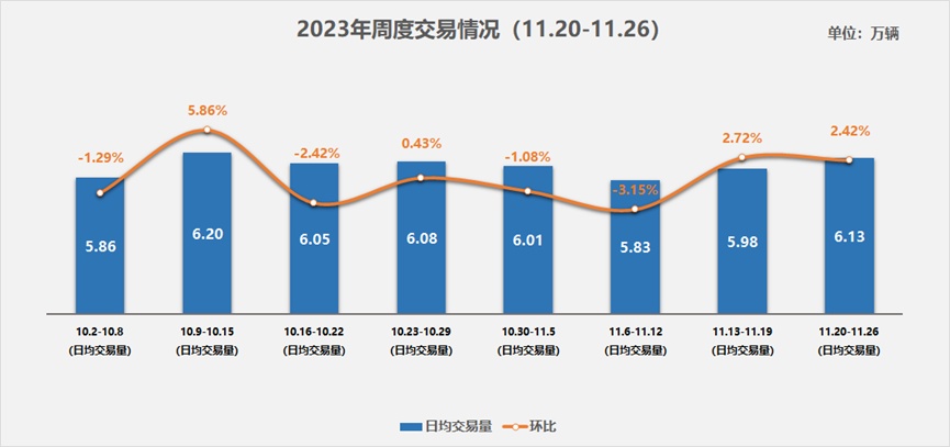 回顾本月前几周的交易情况,第一周二手车市场日均交易量达到了6.01万辆,相较于前一周,环比下降了1.08%。第二周市场开始出现波动,日均交易量下降到5.83万辆,第三周日均交易量5.98万辆,虽有小幅增长但仍处于市场低位徘徊。第四周市场开始进入年底交易的活跃期,预计将持续至12月底。