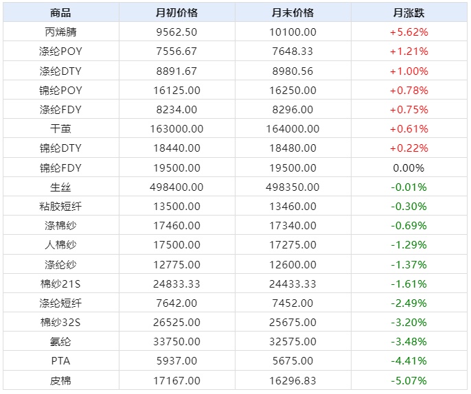 据生意社价格监测,2023年11月纺织价格涨跌榜中上涨的商品共7种,下跌的商品共11种。上涨的主要商品有:丙烯腈(5.62%)、涤纶POY(1.21%)、涤纶DTY(1.00%);下跌的主要商品有:皮棉(-5.07%)、PTA(-4.41%)、氨纶(-3.48%)。