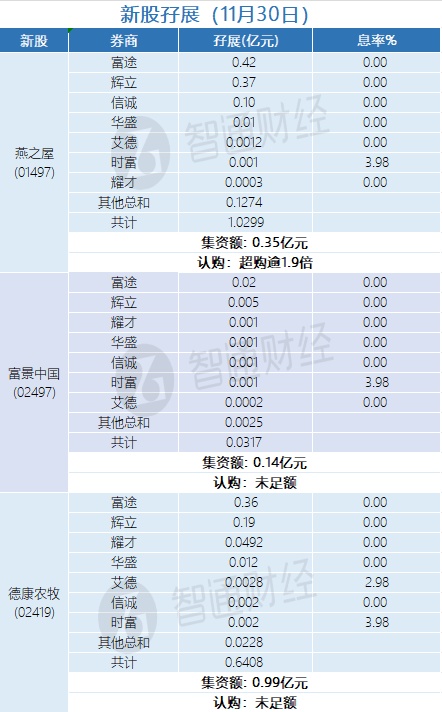 智通财经APP获悉,燕之屋(01497)、富景中国(02497)、德康农牧(02419)正在招股中。截至11月30日,辉立、富途等券商合计为燕之屋借出孖展1.0299亿港元,超购逾1.9倍;合计为富景中国借出孖展0.0317亿港元,认购未足额;合计为德康农牧借出孖展0.6408亿港元,认购未足额。