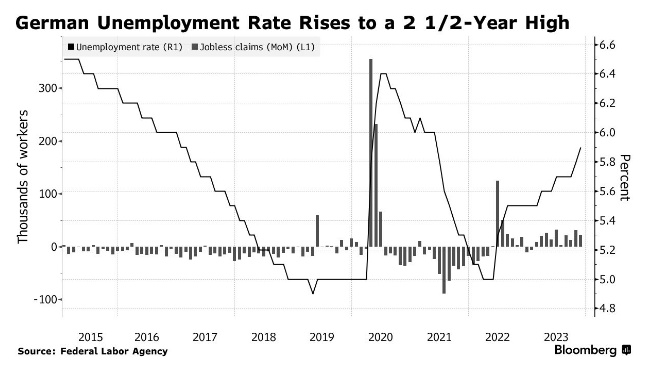 智通财经APP获悉,德国的失业率意外升至两年半以来的最高水平,这一迹象表明,这个欧洲最大经济体的疲软正开始影响其劳动力市场。德国联邦劳工局在周四的一份声明中表示,11月份失业率达到5.9%,高于上月的5.8%。失业人数增加了2.2万人,略高于经济学家的预期中值。