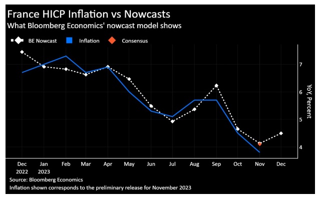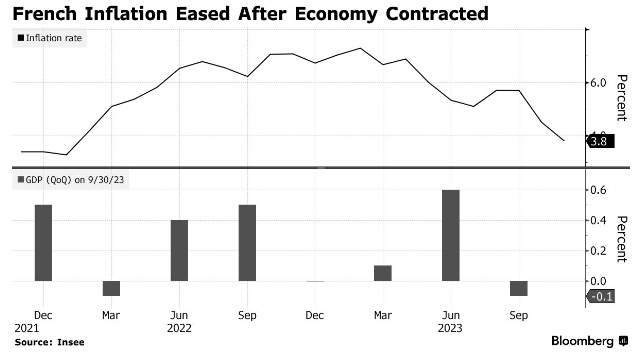 法国第三季度经济意外萎缩,11月份通胀放缓幅度超出预期,这促使投资者加大了对欧洲央行将在春季降息的押注。