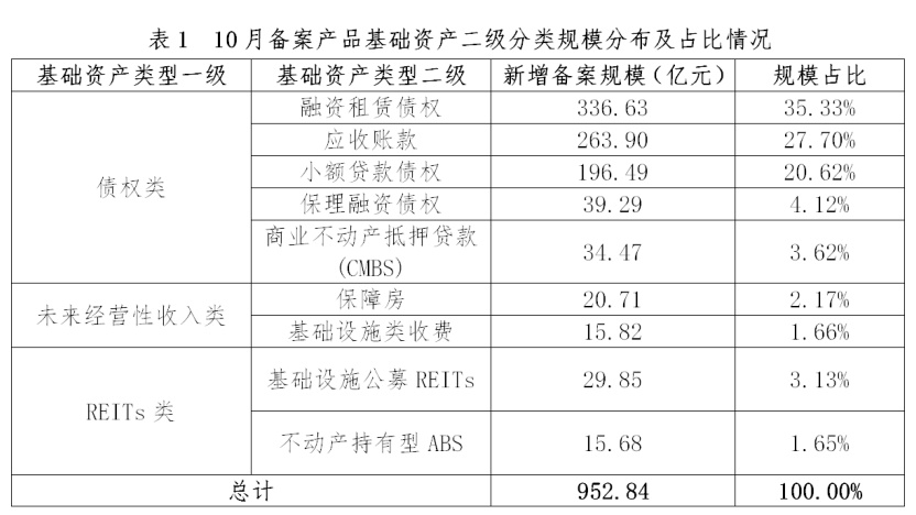 按基础资产一级分类,本月债权类产品新增备案规模870.78亿元;REITs类产品新增备案规模45.53亿元;未来经营性收入类产品新增备案规模36.53亿元。按基础资产二级分类,应收账款、小额贷款债权、融资租赁债权新增备案规模合计占月度备案产品新增备案规模的83.65%。