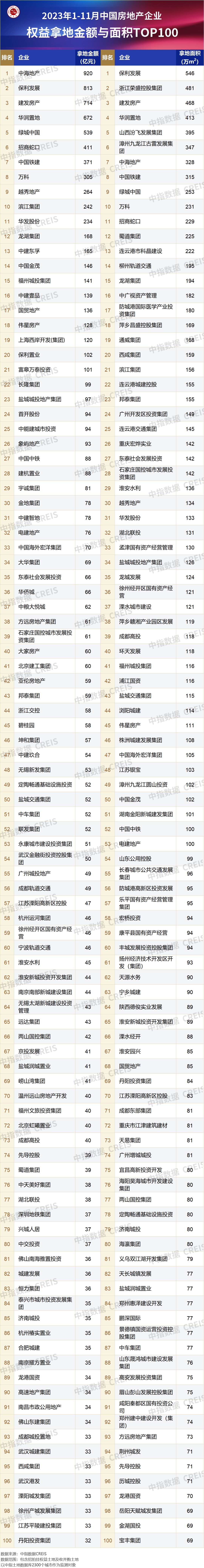 智通财经APP获悉,12月1日,中指研究院发布2023年1-11月全国房地产企业拿地TOP100排行榜。2023年1-11月,TOP100企业拿地总额10855亿元,拿地规模同比下降6.6%,降幅较上月收窄3.4个百分点,连续两月收窄。TOP100门槛值为32亿元,较上年同期下降7亿元。TOP100企业招拍挂权益拿地总额占全国300城土地出让金的比例为52.3%。
