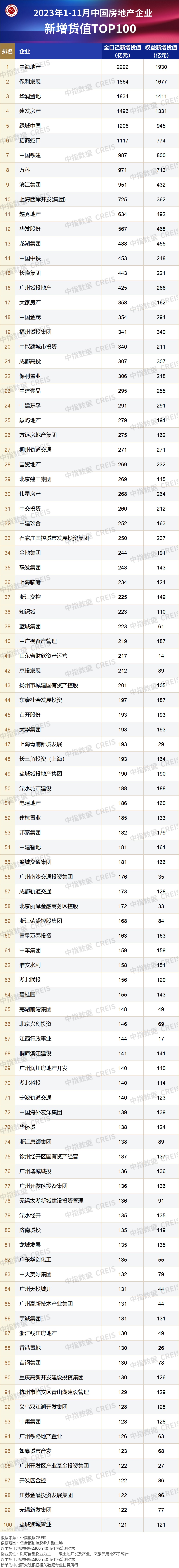 从新增货值来看,中海地产、保利发展、华润置地占据榜单前三位。2023年1-11月,中海地产以累计新增货值2292亿元占据榜单第一;保利发展、华润置地紧随其后,累计新增货值规模分别为1864亿元和1834亿元。TOP10企业2023年1-11月新增货值总额13442亿元,占TOP100企业的41.7%;TOP100企业新增货值门槛为121亿元。