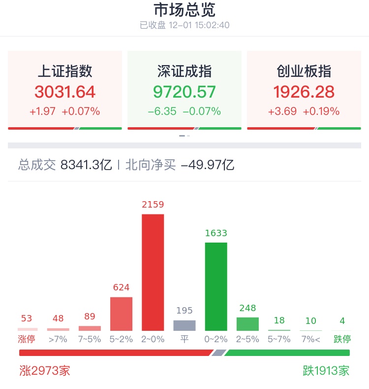 12月1日,A股三大指数总体上演探底回升,此前调整多日的AI赛道重获资金关注,受国有资本运营公司进场买入ETF消息刺激,中字头也强势爆发,汽车产业链延续调整,北交所炒作也持续退潮;北向资金全天净卖出近50亿。