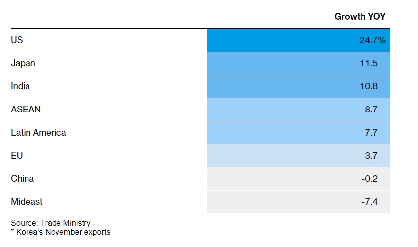 此外,韩国11月份对日本出口较上年同期增长11.5%,对印度出口则增长10.8%。数据显示,对中东地区的出口意外下降了7.4%。