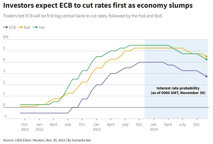 11月初,英国央行首席经济学家Huw Pill表示,2024年中期可能是降息的时候了,希腊央行行长Yannis Stournaras也表达了这一观点。