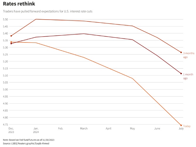 货币市场目前预计美联储和欧洲央行明年将分别降息逾100个基点,并在本周将首次降息的预期时间坚定地提前至2024年上半年。
