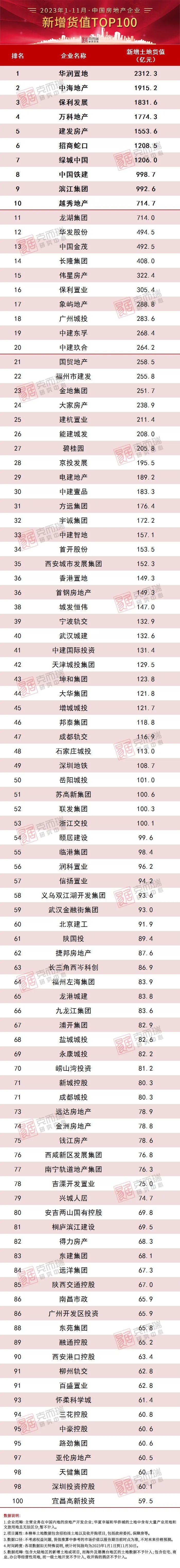 智通财经APP获悉,12月1日,克而瑞地产研究发布《2023年1-11月中国房地产企业新增货值TOP100排行榜》。11月末,新增货值百强门槛59.5亿元,较10月末仅增加3.8亿元,同比降幅依然高达22%。新增货值集中度持续趋稳。截止11月末,10强房企新增货值占64%,较十月末回升1个百分点,11-20强房企新增货值占比19%,与上月末基本持平。克而瑞地产表示,11月土地市场整体走势呈现量平价跌,处于筑底阶段。房企目前仍受到“销售疲软”和“化债风险”两重压力,投资回暖还需更长时间,预计年底至2024年上半年都将保持谨慎的投资态度。