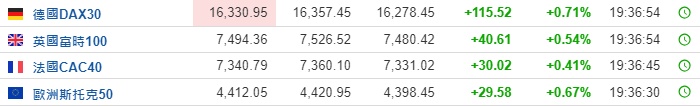 2. 截至发稿,德国DAX指数涨0.71%,英国富时100指数涨0.54%,法国CAC40指数涨0.41%,欧洲斯托克50指数涨0.67%。