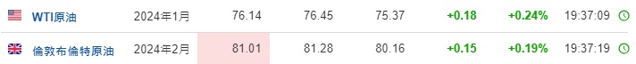 3. 截至发稿,WTI原油涨0.24%,报76.14美元/桶。布伦特原油涨0.19%,报81.01美元/桶。