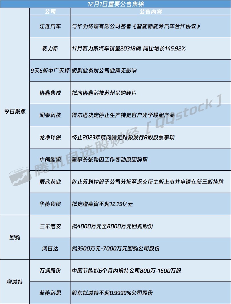 1、江淮汽车:与华为终端有限公司签署《智能新能源汽车合作协议》