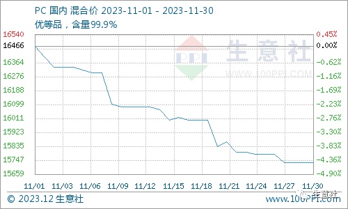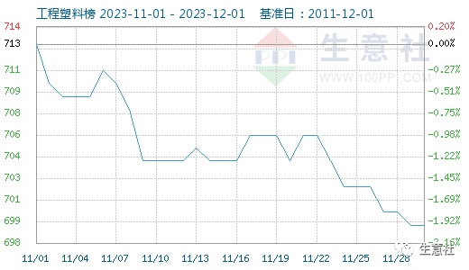 据生意社价格监测,2023年11月工程塑料价格涨跌榜中下跌的商品共4种,上涨的商品仅1种。下跌的主要商品有:PC(-4.45%)、PET(-2.10%)、PA66(-0.78%);上涨的是POM(1.36%)。