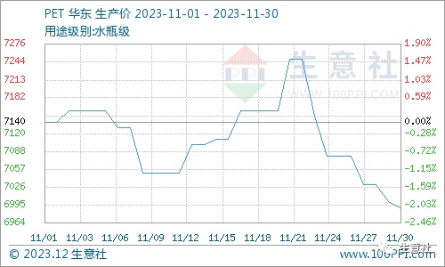 11月PET水瓶级行情震荡运行,价格位置窄幅走跌。月末行业负荷较月初窄幅下降1%至73%左右,国内市场总体供应平稳,整体供应压力不明显。月初国内政策消息面偏暖,加之PTA与乙二醇中上旬走势偏强,PET行情尚能维持均衡。但受到国际原油下挫连带,下旬双原料齐跌,加之下游补货心态不佳,消费水平处于淡季水准,成本面支撑位置失守叠加需求疲弱,业者心态受到打压。月末商家偏向让利走单,场内交投归于清淡。综合来看,当下PET市场利空主导,预计短期内PET市场行情或将仍有下跌。