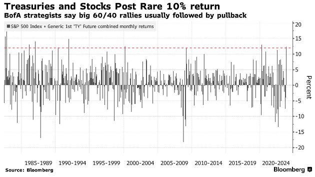 随着交易员对美联储已经完成加息的信心增强,股票和债券上个月同步上涨,标准普尔500指数和10年期美国国债合计上涨了12%。历史数据显示,在过去的40年里,美国股票和债券的月回报率只有10次达到或超过12%。