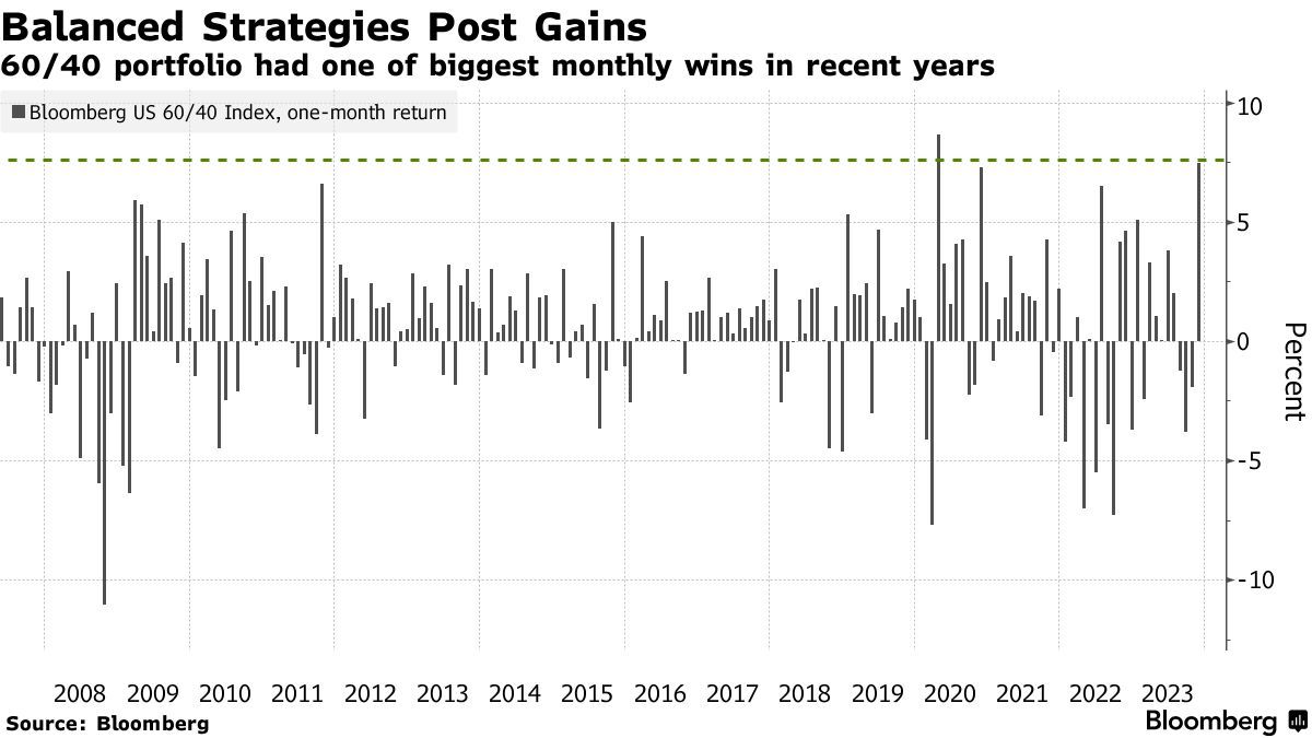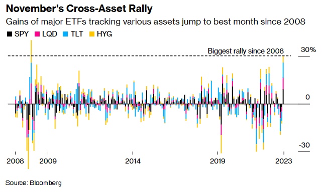 以几乎所有标准衡量,11月的市场反弹都是巨大的。美债收益率大幅下跌为股市、信贷市场和新兴市场的强劲反弹奠定了基础,Bloomberg 60/40指数创下了有记录以来的最佳月份之一。追踪加密货币、首次公开募股(IPO)和尚未盈利的科技股的指数大幅上升——这些资产类别在美债收益率飙升时纷纷举步维艰。“木头姐”凯西·伍德旗下的ARKK创新ETF在11月的涨幅达到了创纪录的31%。