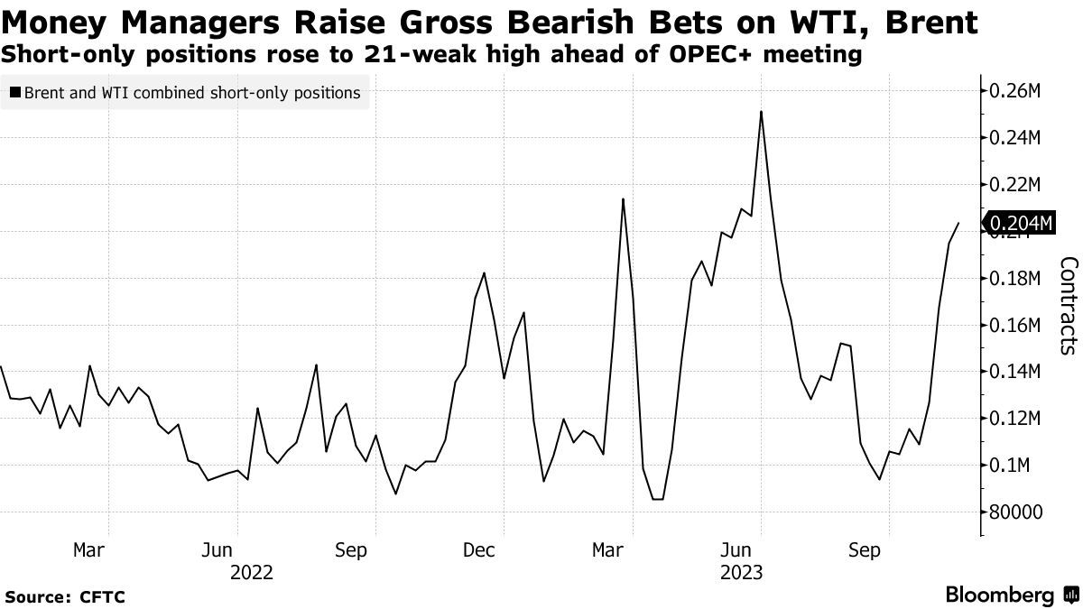 智通财经APP获悉,对冲基金在备受期待的OPEC+会议召开之前加大了对油价的看跌押注。洲际交易所和美国商品期货交易委员会(CFTC)的数据显示,截至11月28日当周,对冲基金的石油空头头寸增加了6,665手,至210,135手,为21周以来最高水平。