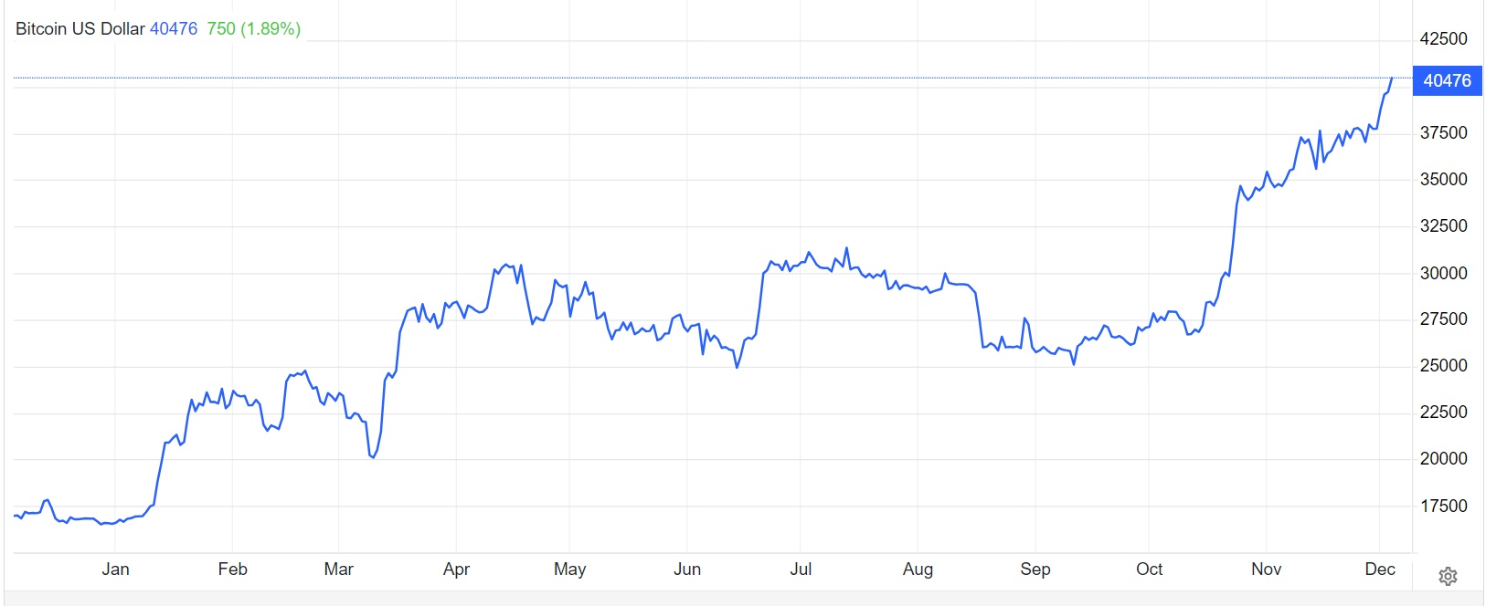 智通财经APP了解到,加密货币行业的一些资深高管坚称,比特币新一轮牛市已经开始,同时一些对比特币极度乐观的机构投资者高喊比特币将在2024年一举突破10万美元大关,进而创下历史新高。比特币今年可谓开启“疯牛”行情,年内暴涨超过120%,当前已突破4万美元大关(自2022年5月来的最高点)。许多投资者乐观地认为,这种涨势将持续到2024年。比特币现货ETF将于明年在美国获得批准的预期,加之美联储降息预期升温,引发了人们对加密货币市场的兴奋情绪,推动比特币价格大涨。