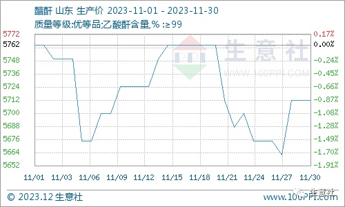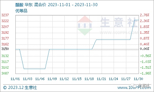 月初下游需求表现低迷,市场成交有限,加上买涨不买跌情绪影响,醋酸价格延续10月走势继续下探,之后随着醋酸装置故障频发、企业降负等消息释放,场内醋酸产能利用率下降,厂家多维持低库存运行,供方利好支撑下,业者看涨意向增加,部分厂家醋酸报价上涨,后期下游产能利用率提升,对醋酸需求好转,双重利好下,醋酸价格止跌回暖。