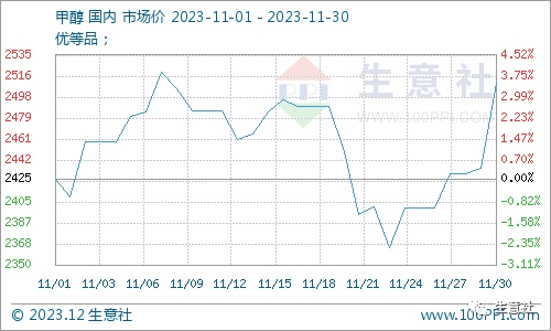 11月原料端甲醇市场行情宽幅震荡,截至11月30日国内甲醇市场均价在2510元/吨,与11月1日价格2425元/吨相比,月内整体上涨3.50%。上旬,部分主产地区存新增计划外检修及降负装置,区域内供应减少,甲醇价格偏强上涨。中旬,煤炭价格止跌回升,对甲醇价格存一定支撑,但下游接货意愿一般,成本传导有限,甲醇行情波动整理。下旬,天然气限制出口生产,供应减少,成本面利好甲醇市场行情,同时下游部分产品价格走高,陆续补充货源为主,需求端同步利好,甲醇价格回暖上行。月内甲醇价格走势震荡整理。
