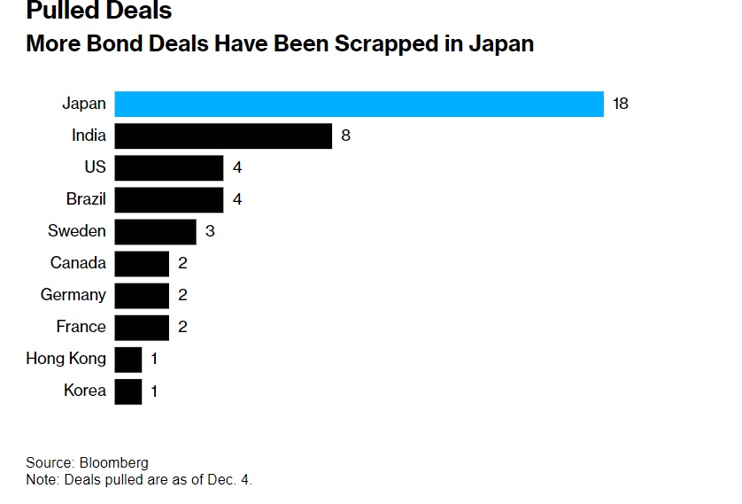 机构汇编的数据显示,截至11月,日本和外国借款人的日元计价公司债券发行规模连续两个月下降。尽管到目前为止,2023年的发行量同比增长了30%,达到创纪录的17.7万亿日元(1210亿美元),借款人在今年可谓争先恐后地在成本进一步上升之前进入市场。