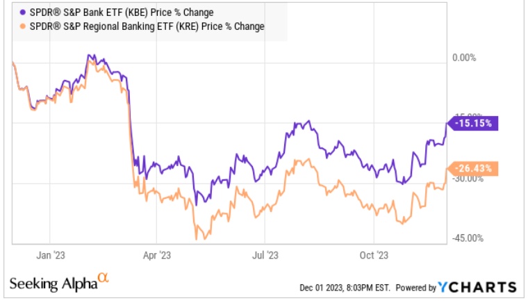 美国五家银行机构在2023年美国银行业危机期间倒闭,令投资者感到不安,主要的地区性银行股遭到抛售。投资者目前仍对这一细分市场感到紧张,因为他们对这些银行的稳定性和风险状况存在相当大的疑虑。其中,对标标普500银行股的两只广受全球投资者欢迎的ETF——SPDR标普银行ETF (KBE.US)和SPDR标普地区银行ETF (KRE.US)已惨遭市场大幅抛售,尤其是后者受到金融业担忧的影响要大得多。