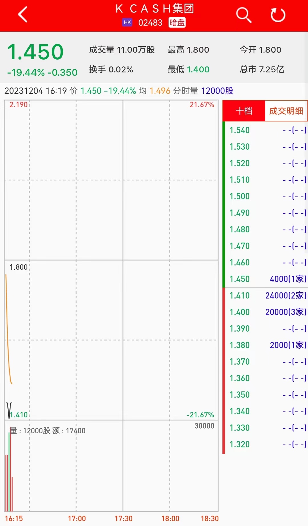 智通财经APP获悉,K CASH集团(02483)将于12月5日(周二)在香港挂牌。截至发稿,利弗莫尔证券暗盘交易显示报价1.45港元,较招股价1.80港元下跌19.44%。每手2000股,不计手续费,每手亏700港元。