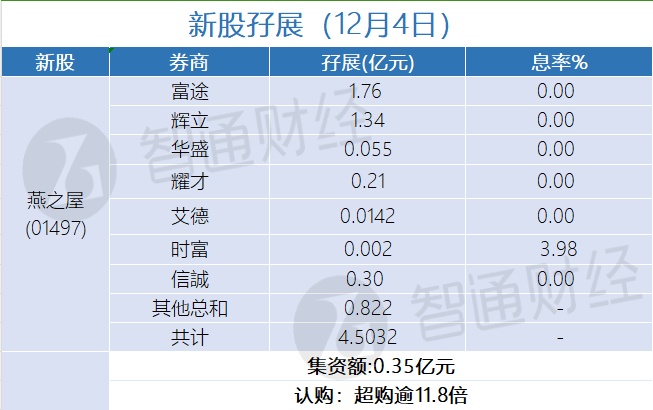智通财经APP获悉,燕之屋(01497)、富景中国(02497)正在招股中。截至12月4日,辉立、富途等券商合计为燕之屋借出孖展4.5032亿港元,超购逾11.8倍;合计为富景中国借出孖展0.9974亿港元,超购逾6.1倍。