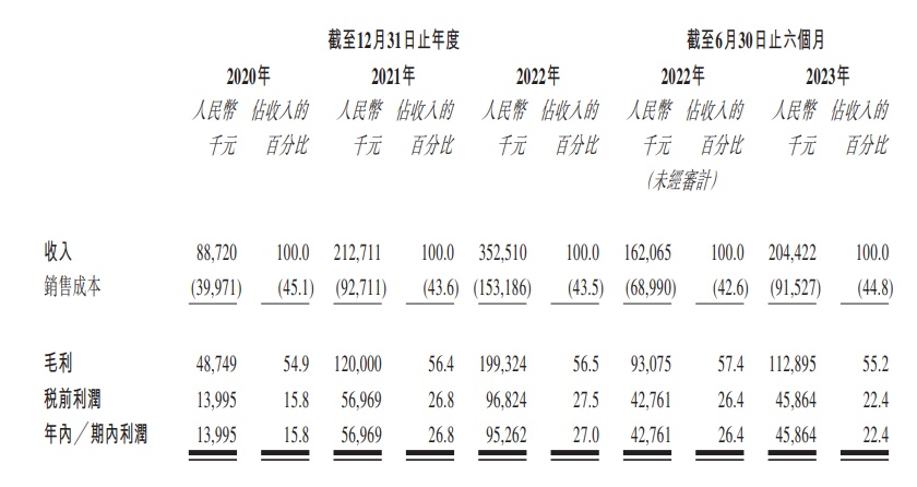 财务方面,于2020年度、2021年度、2022年度以及2022年、2023年截至6月30日止六个月,贝克微电子实现收入分别约为8872万元、2.13亿元、3.53亿元、1.62亿元以及2.04亿元人民币;同期,该公司实现期内利润1399.5万元、5696.9万元、9526.2万元、4276.1万元以及4586.4万元。