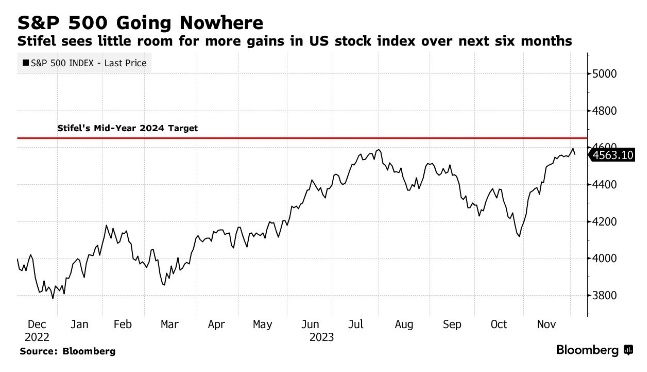 最新的观点再一次使Bannister在新的一年里成为异类。华尔街的其他预测者对明年的美国股市更加乐观,包括美国银行、德意志银行和加拿大皇家银行资本市场在内的投行预计,标普500指数将在2024年收盘前创下历史新高。