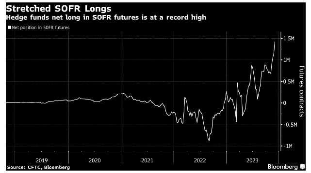 最近几个交易日,交易员们一直在期货、期权和现货市场加大对明年降息的定价。美国商品期货交易委员会(CFTC)上周五公布的数据显示,SOFR期货的杠杆净仓位创下新高。