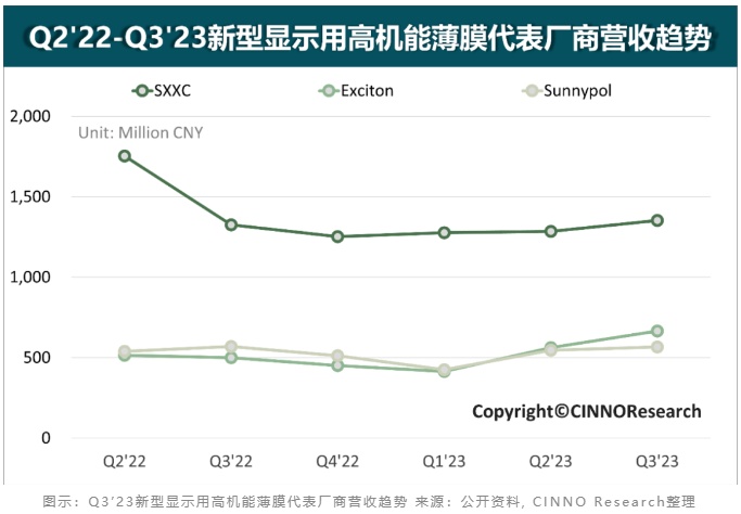 根据CINNO Research产业统计数据,Q3’23国内新型显示用高机能薄膜厂商营收整体呈增长趋势,受经济下行压力增大、市场需求变弱等因素影响,行业毛利率仍维持低位。