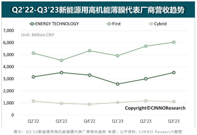 根据CINNO Research产业统计数据,Q3’23国内新能源用高机能薄膜厂商营收整体呈增长趋势,受原料价格波动、竞争及供需关系变化等因素影响,行业毛利率小幅下滑。