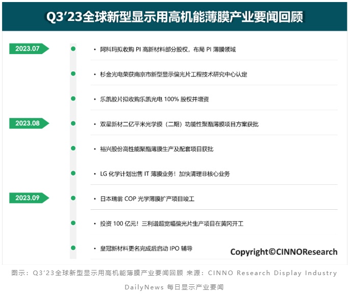 根据CINNO Research每日显示产业要闻,Q3’23新型显示用高机能薄膜领域,澳中集团韶关项目、双星新材宿迁二期项目、瑞翁日本敦贺项目、三利谱黄冈项目、皖维高新巢湖项目等多个高机能薄膜项目规划、建设、投产。