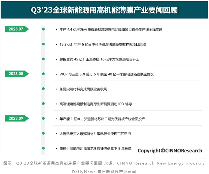 根据CINNO Research每日新能源产业要闻,Q3’23新能源用高机能薄膜领域,康辉新材营口项目、福斯特江门项目、中科华联蚌埠项目、回天新材常州项目、恩捷股份玉溪项目、弘道新材苏州二期项目等多个高机能薄膜项目规划、建设、投产。