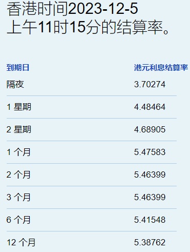 智通财经APP获悉,12月5日,港元拆息连续两日全线下跌,其中,隔夜息低见3.70274%,连跌六日,续创一个半月新低。与楼按相关的一个月拆息则报5.47583%,亦见逾一周新低。反映银行资金成本的三个月拆息五连跌,今日进一步降至5.46399%,创逾两周新低。六个月及一年期分别跌至5.41548%及5.38762%。