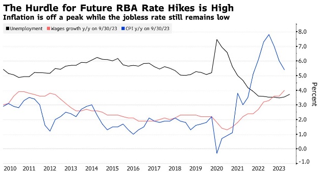 消息公布后,澳元下跌0.6%,对政策敏感的澳大利亚3年期国债收益率回吐了早些时候的涨幅,在4%附近波动。掉期交易员削减了对澳洲联储将再次加息的押注。他们现在认为,2024年上半年加息的可能性不到30%,而在声明发布前,再加息的可能性超过40%。
