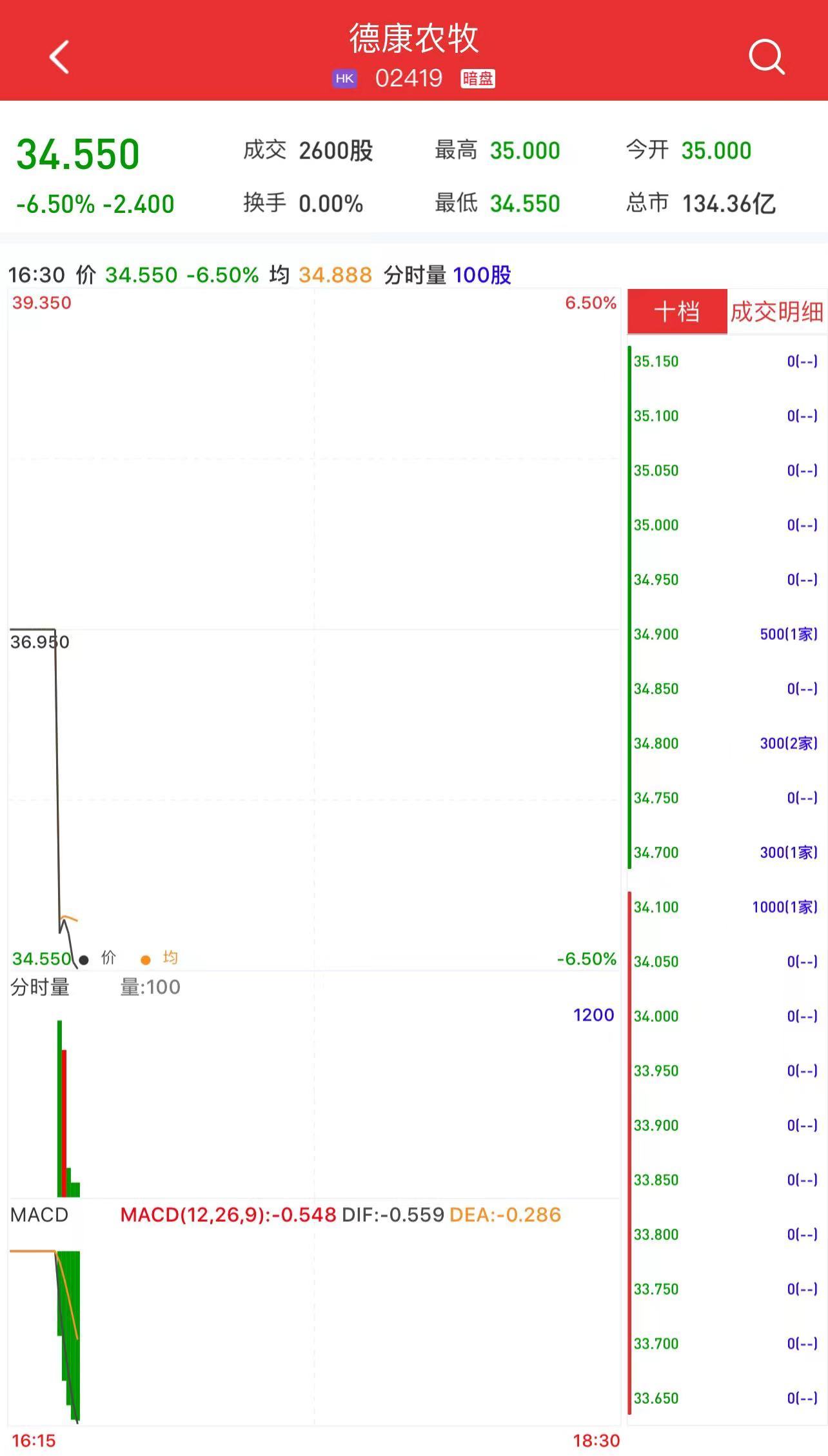 智通财经APP获悉,德康农牧(02419)将于12月6日(周三)在香港挂牌。截至发稿,利弗莫尔证券暗盘交易显示报价34.55港元,较招股价36.95港元下跌6.5%。每手100股,不计手续费,每手亏240港元。