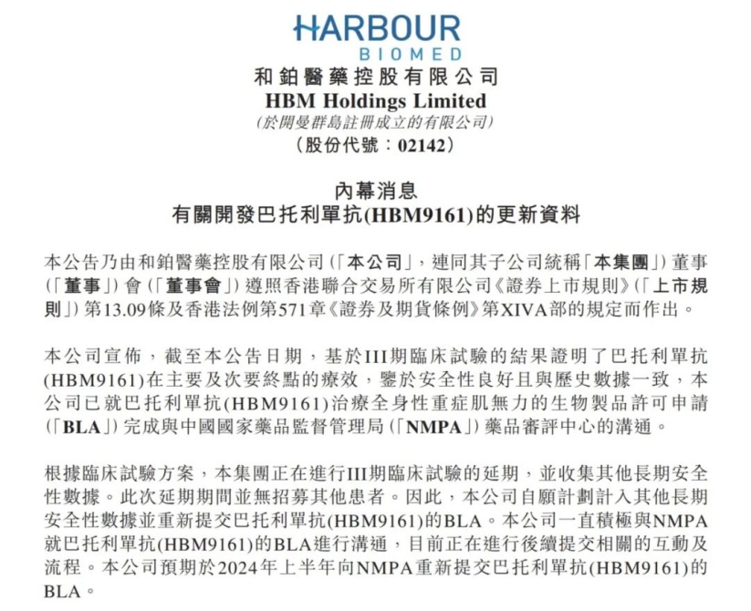 也正是基于此,和铂医药在今年6月递交了该产品的上市申请。但12月1日,和铂医药宣布自行撤回了该申请,理由是因为巴托利单抗的III期研究延期且需要收集其他长期安全性数据。