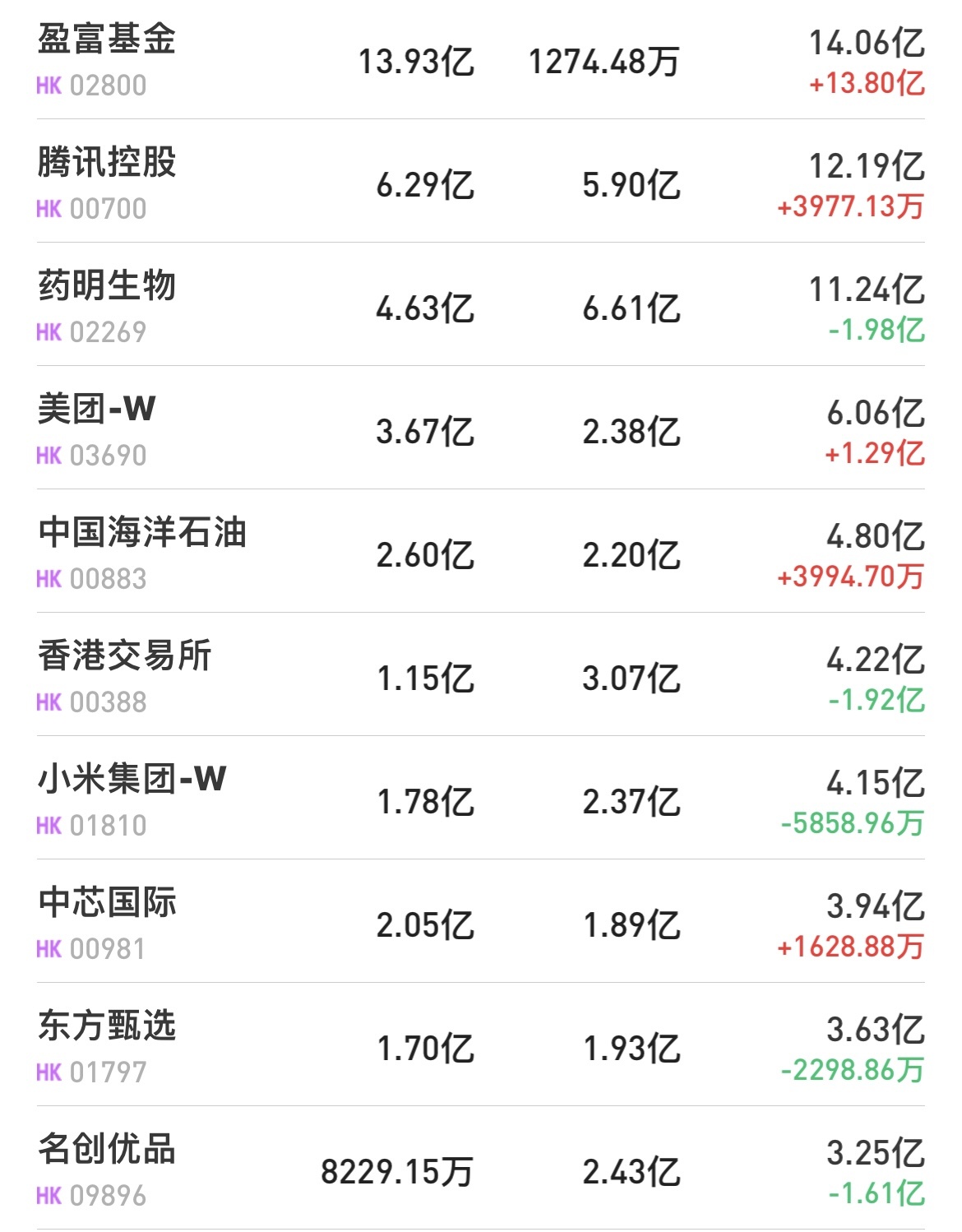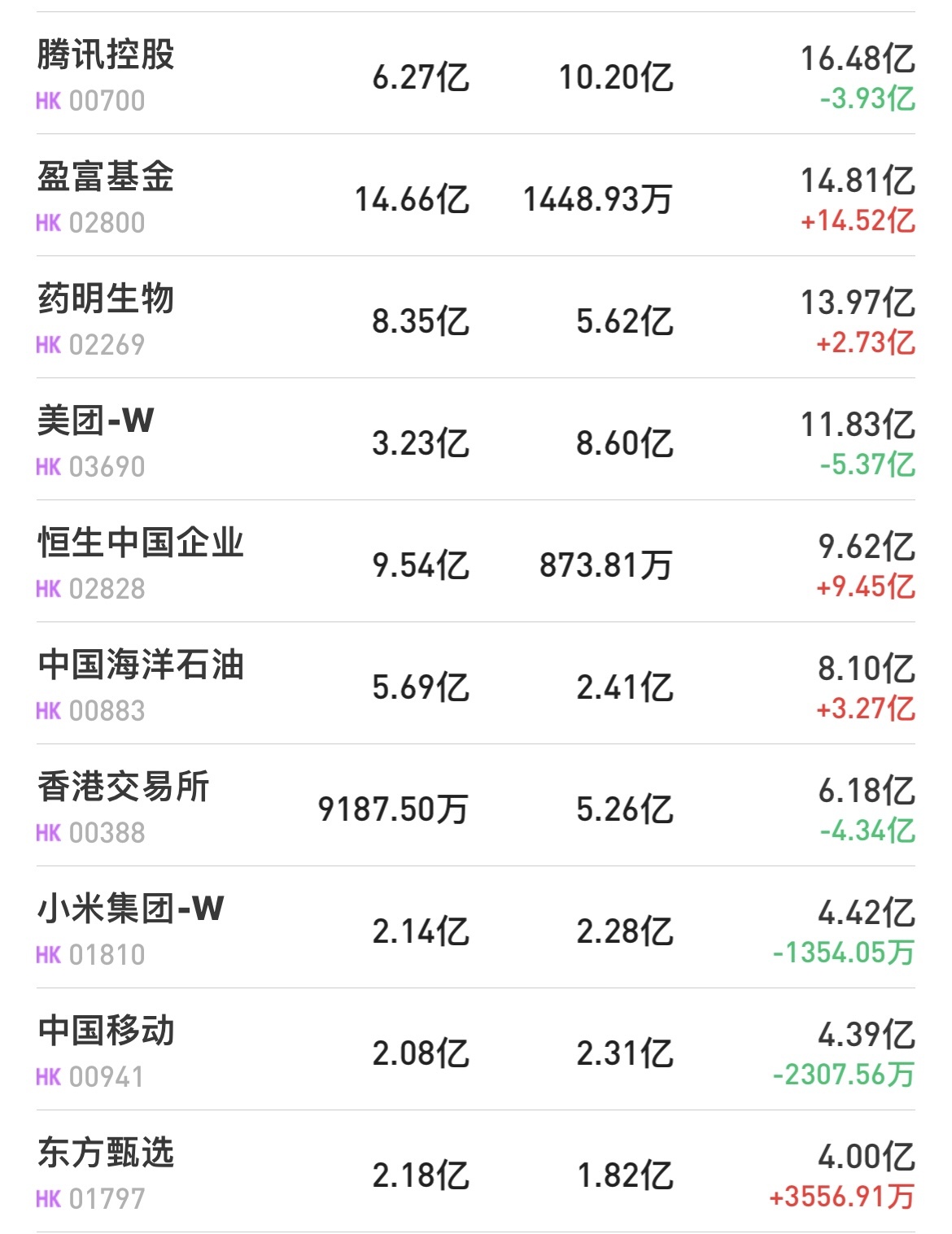 北水净买入最多的个股是盈富基金(02800)、恒生中国企业(02828)、中国海洋石油(00883)。北水净卖出最多的个股是香港交易所(00388)、腾讯控股(00700)、中国移动(00941)。