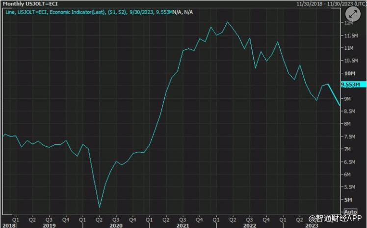 智通财经APP获悉,美国在10月份的JOLTs职位空缺数量下降至873.3万,低于930万的预期值,是自2021年3月以来的最低点。这一趋势显示出原本紧张的劳动市场可能正在放松。10月份,JOLTs职位空缺下降了61.7万,降幅为6.6%,使得每位失业者平均可找到1.34个职位,这一比例是自2021年8月以来的最低水平,几乎回到了疫情前的状态,远低于几个月前的1比2比例。9月份的数据也被下修,从955万修正为935万。