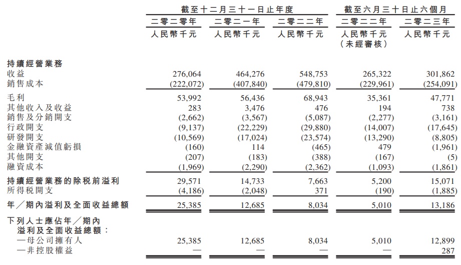 财务方面,于2020年、2021年、2022年以及2023年截至6月30日止6个月,云工场实现收益分别约为2.76亿元、4.64亿元、5.49亿元以及3.02亿元人民币。在营收快速增长的同时,云工场的利润增长并不理想。2020年至2022年,年内溢利分别约为2538.5万元、1268.5万元、803.4万元人民币,毛利率分别为19.6%、12.2%、12.6%,总体呈下降趋势。