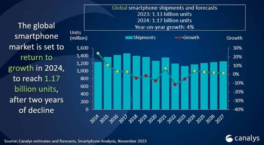 另一市场研究机构Canalys近日发布报告称,2022年全球智能手机市场经历大幅下滑12%后,2023年第四季度前后市场呈现初步的复苏态势。尽管Canalys预计2023年智能手机出货量仍下降5%,但下降趋势已有所放缓。