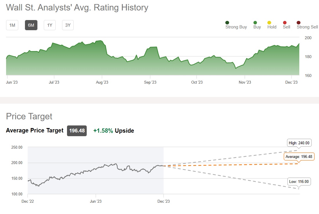 Seeking Alpha汇编的华尔街分析师共识评级以及目标价显示,华尔街分析师们对苹果的共识评级为“买入”,平均目标价预期达196.48美元,最高目标价则为240美元,意味着仍有小幅上涨潜力。