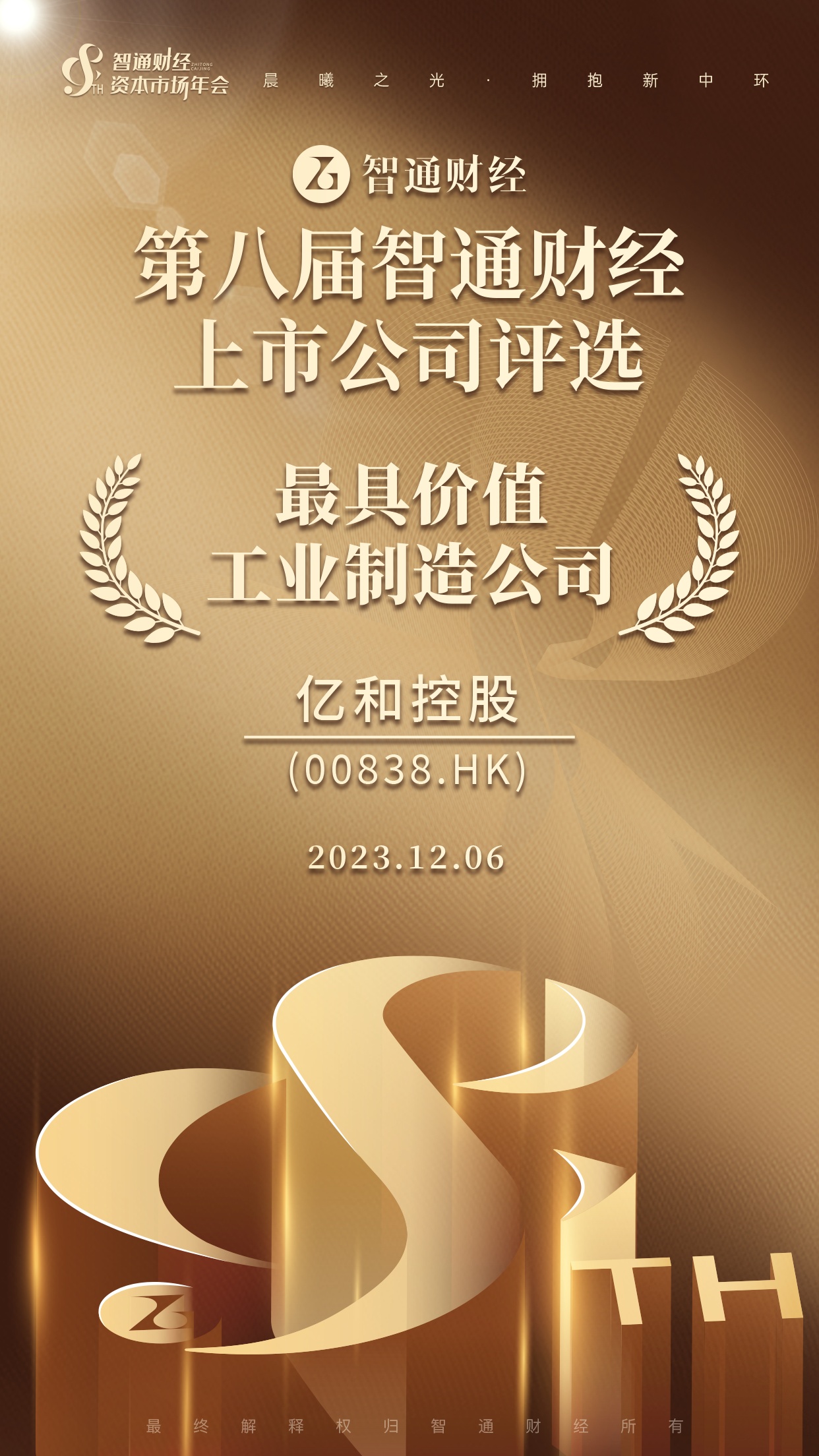 2023年12月6日上午12点,在“第八届智通财经资本市场年会暨上市公司颁奖典礼”上,亿和控股(00838)荣获“最具价值汽车公司”和“最具价值工业制造公司”奖项。
