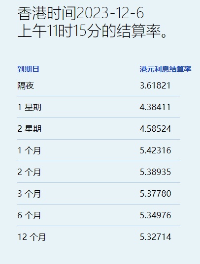 智通财经APP获悉,12月6日,港元拆息连续三日全线下跌,其中,隔夜息低见3.61821%,连跌七日,续创逾一个半月新低。与楼按相关的一个月拆息报5.42316%,亦见逾一周新低。反映银行资金成本的三个月拆息六连跌,今日进一步降至5.3778%,创近三周新低。六个月及一年期分别降至5.34976%及5.32714%。