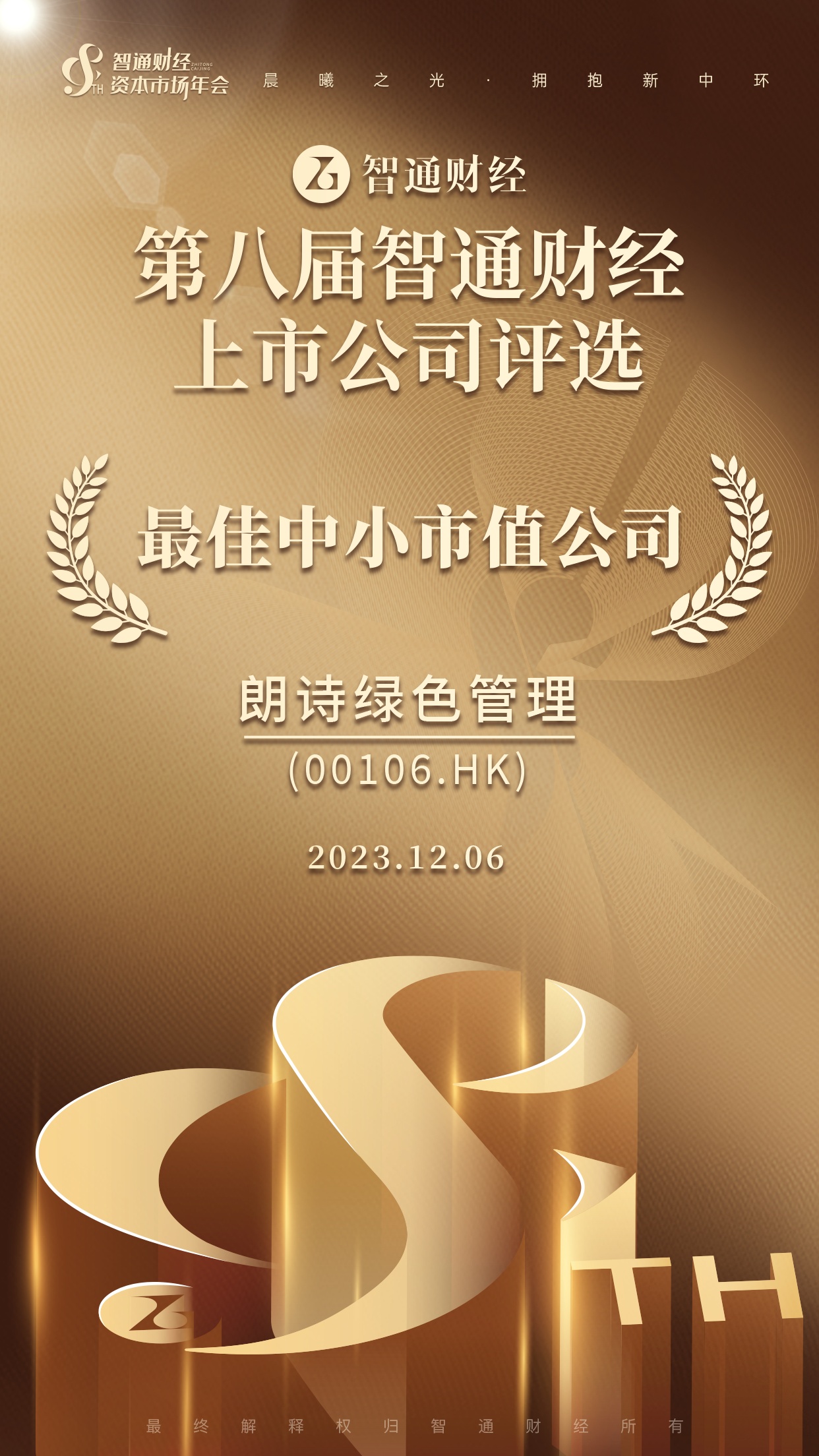 2023年12月6日上午12点,在“第八届智通财经资本市场年会暨上市公司颁奖典礼”上,朗诗绿色管理(00106)荣获“最佳中小市值公司”奖项。