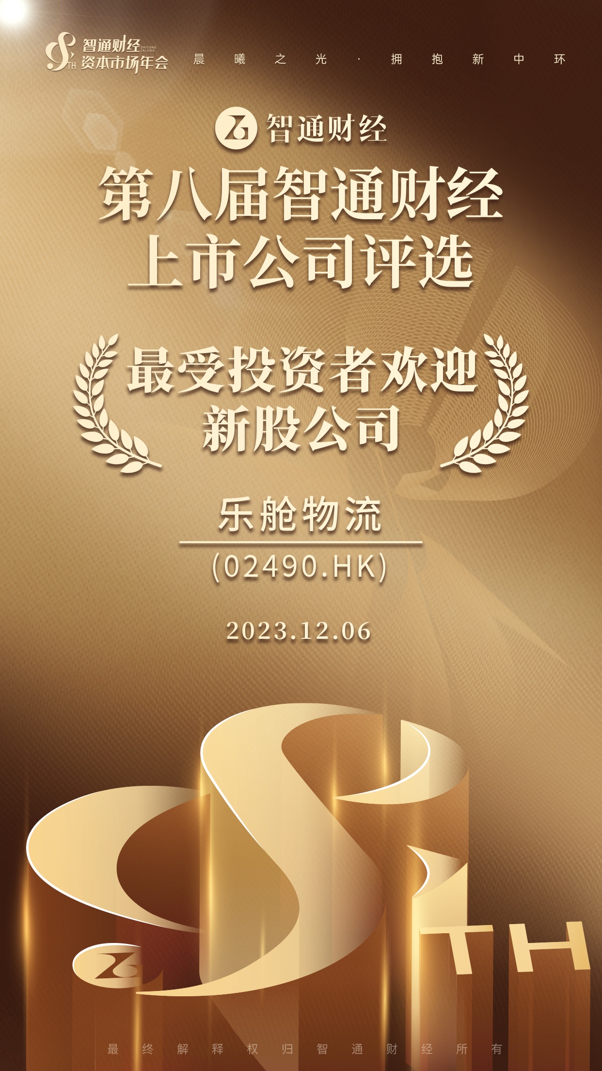 2023年12月6日上午12点,在“第八届智通财经资本市场年会暨上市公司颁奖典礼”上,乐舱物流(02490)荣获“最受投资者欢迎新股公司”奖项。
