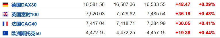 2.截至发稿,德国DAX指数涨0.29%,英国富时100指数涨0.48%,法国CAC40指数涨0.41%,欧洲斯托克50指数涨0.44%。