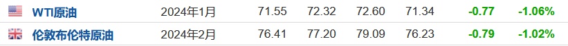 3. 截至发稿,WTI原油跌1.06%,报71.55美元/桶。布伦特原油跌1.02%,报76.41美元/桶。